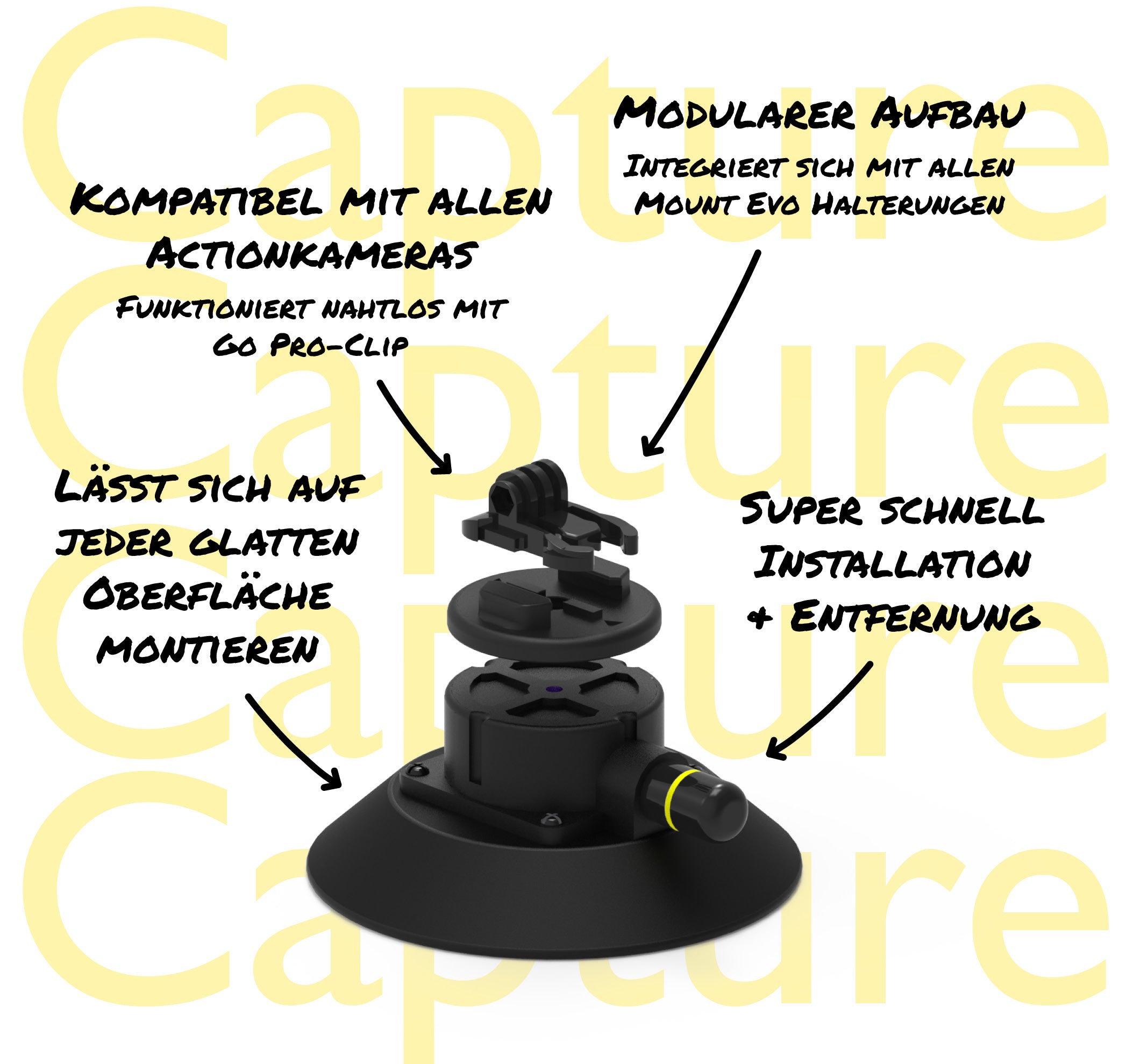 Capture verwendet Vakuumnäpfe in Industriequalität und ist eine der stärksten Vakuumhalterungen für Actionkameras. Sie hält einer Kraft von 100 kg stand und funktioniert bei jedem Wetter.