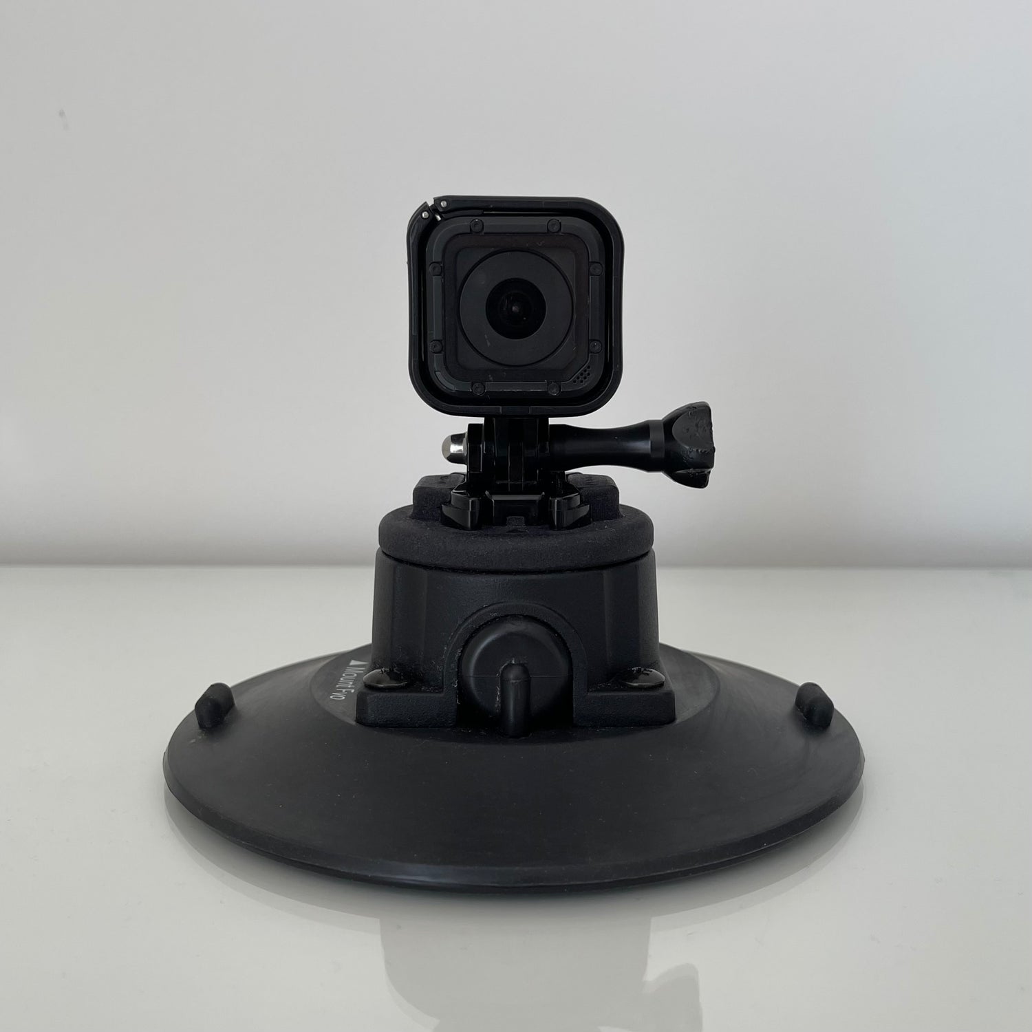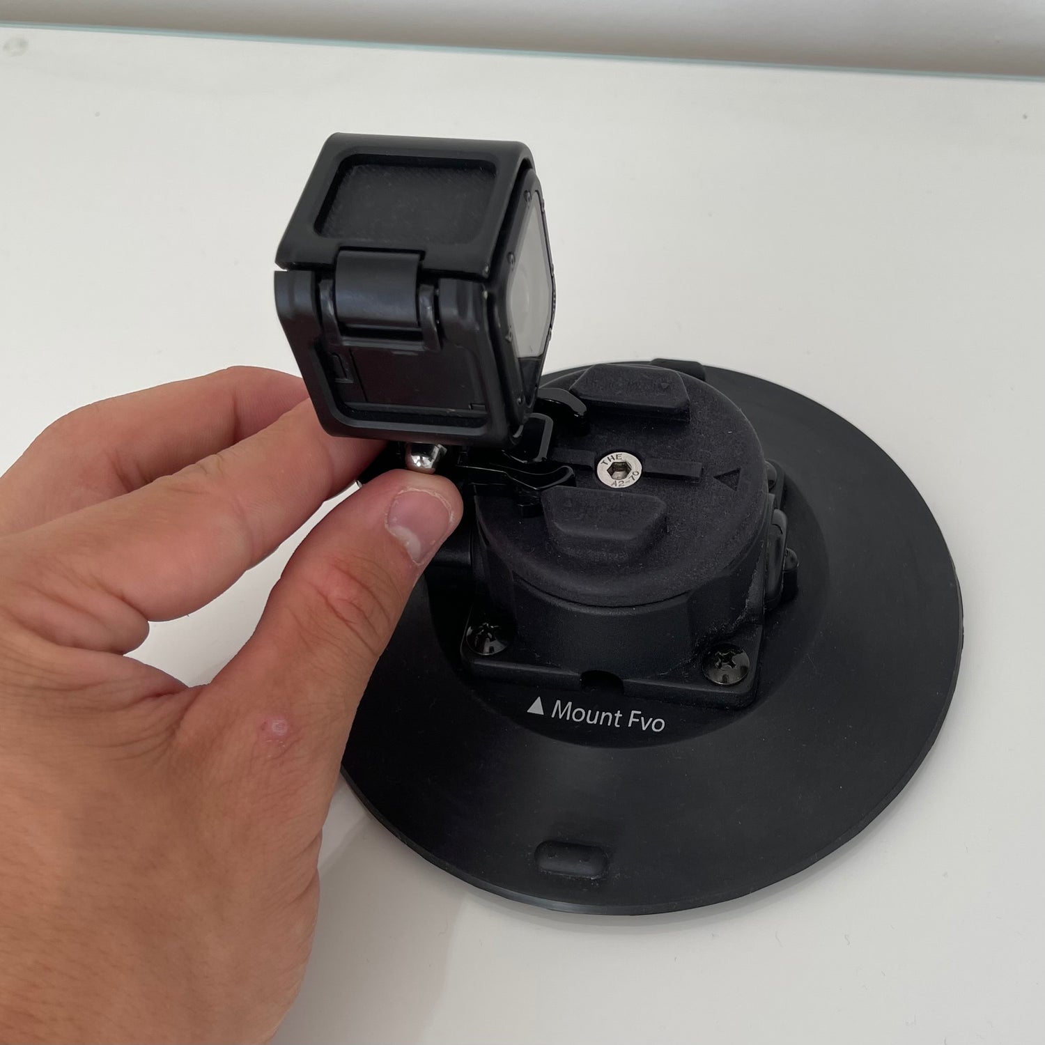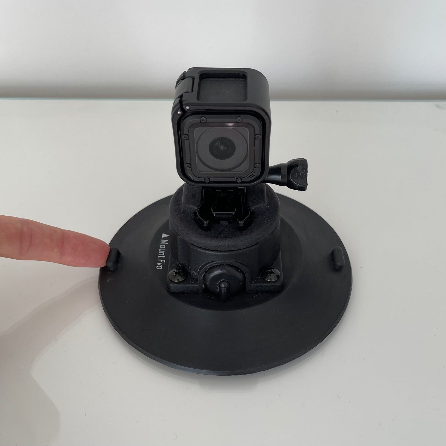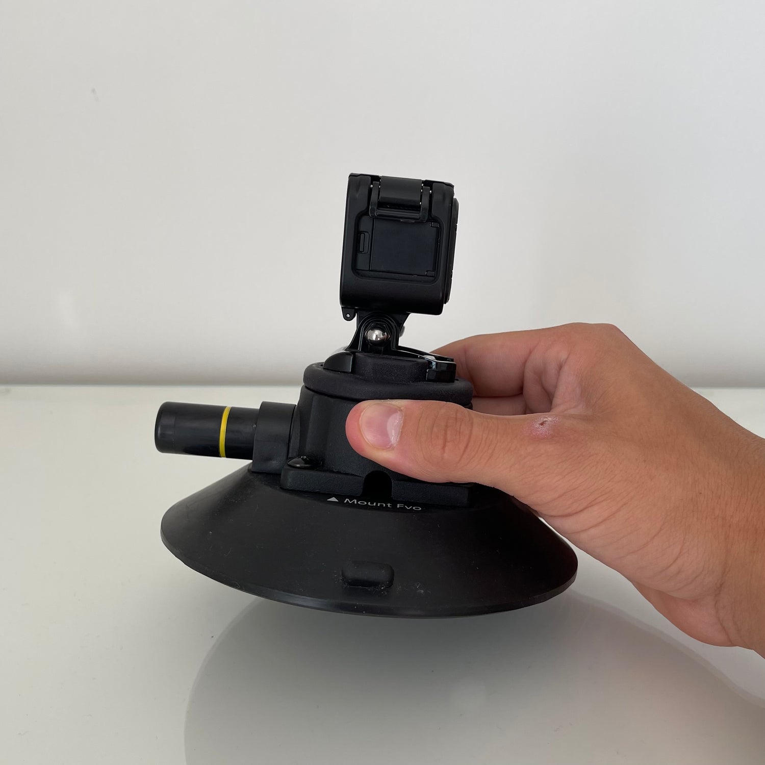 Positionnez Capture à l'endroit de montage souhaité, puis commencez à pomper le piston sur le côté de la ventouse. Une fois que la bande indicatrice jaune sur le piston n'est plus visible, Capture est sécurisé.