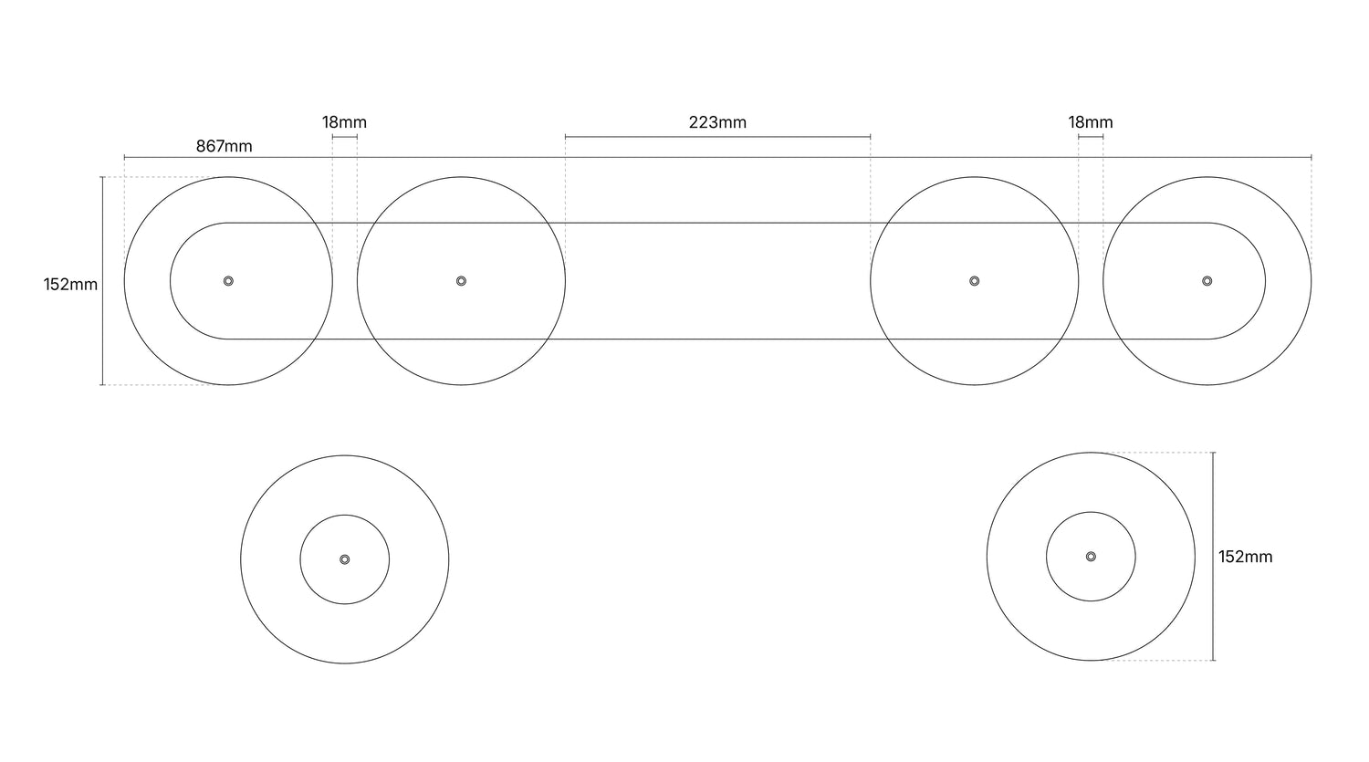 - Dimensions - Support de roue arrière (x2) - L152mm x L152mm x H72mm.